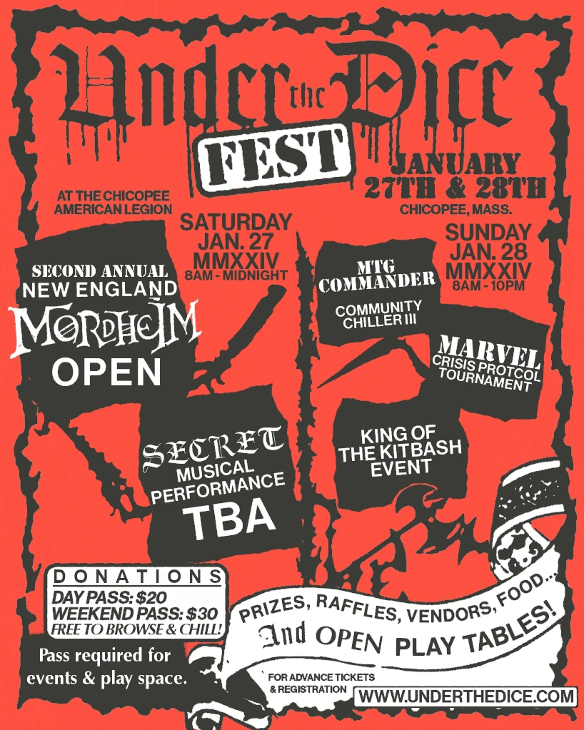 Saturday will be the return of NEMO (The New England Mordheim Open) as well as open play tables all throughout the afternoon into the evening. This year we will be doing 3 rounds of narrative play. Tables will remain up after the event, allowing everyone to continue the campaign through the remainder of the weekend. Taking us through the day we’ll be having some special guests doing musical performances to help set the tone, with something a little heavier to close the night out. More on that will be released in time.