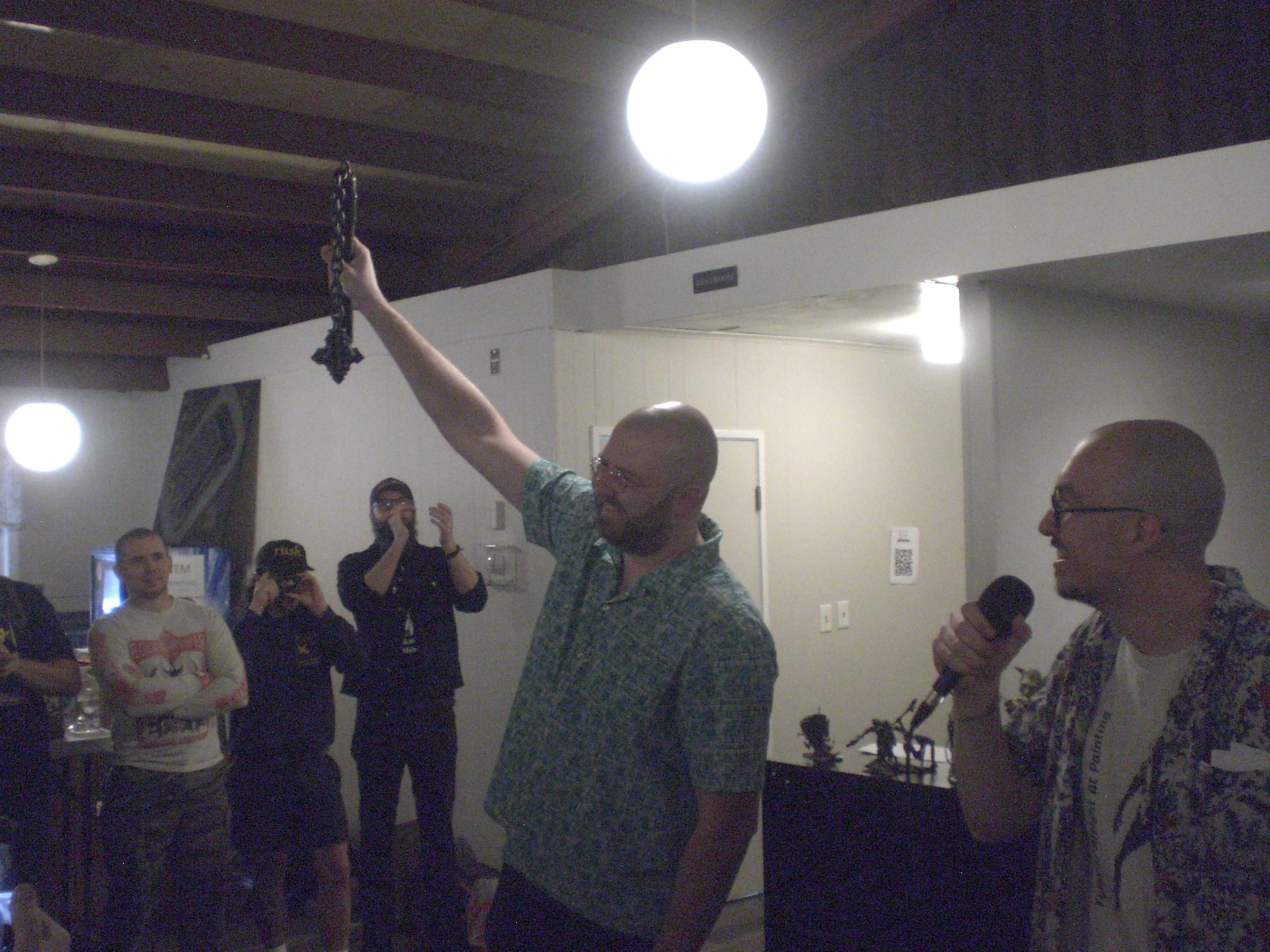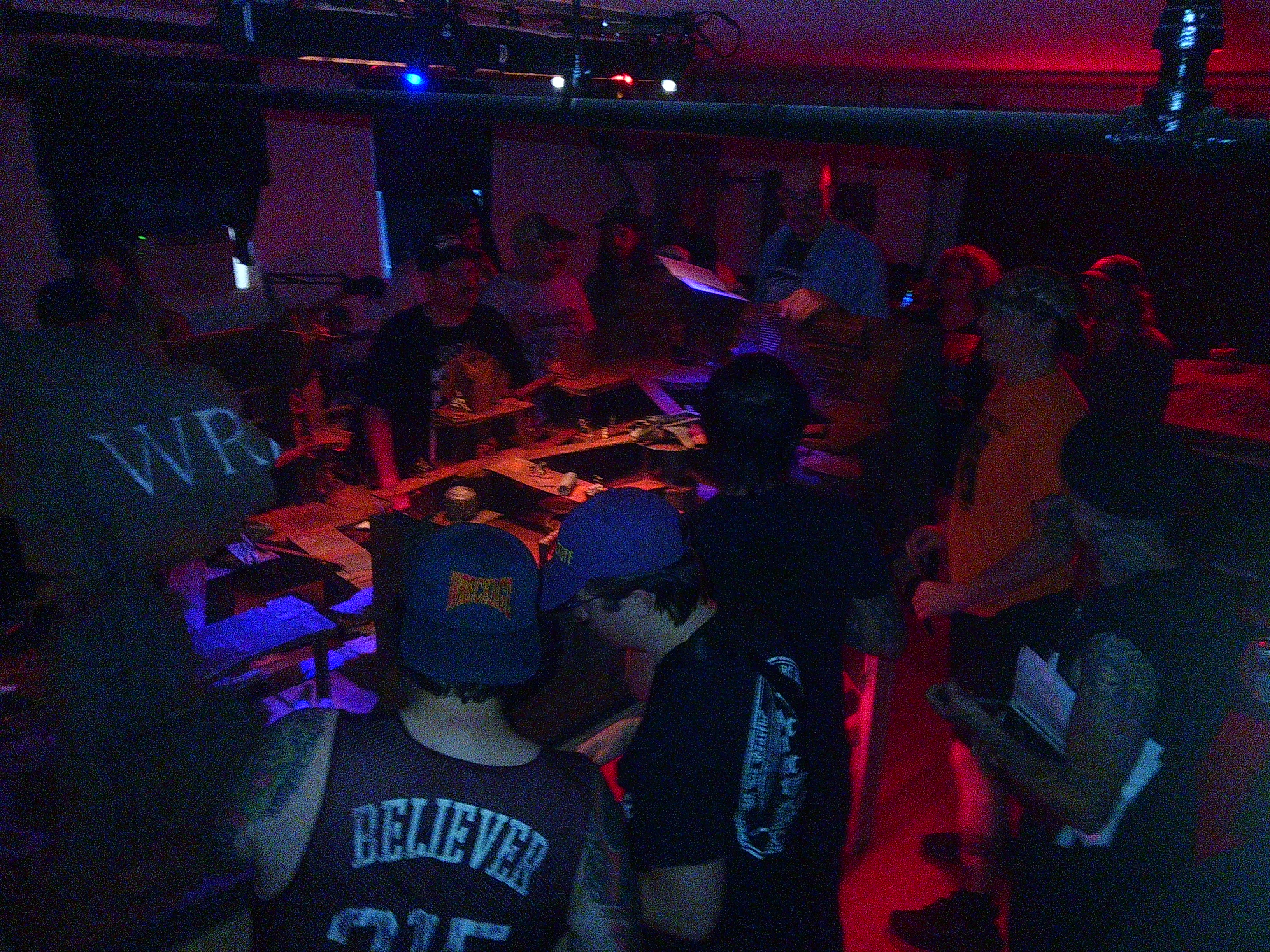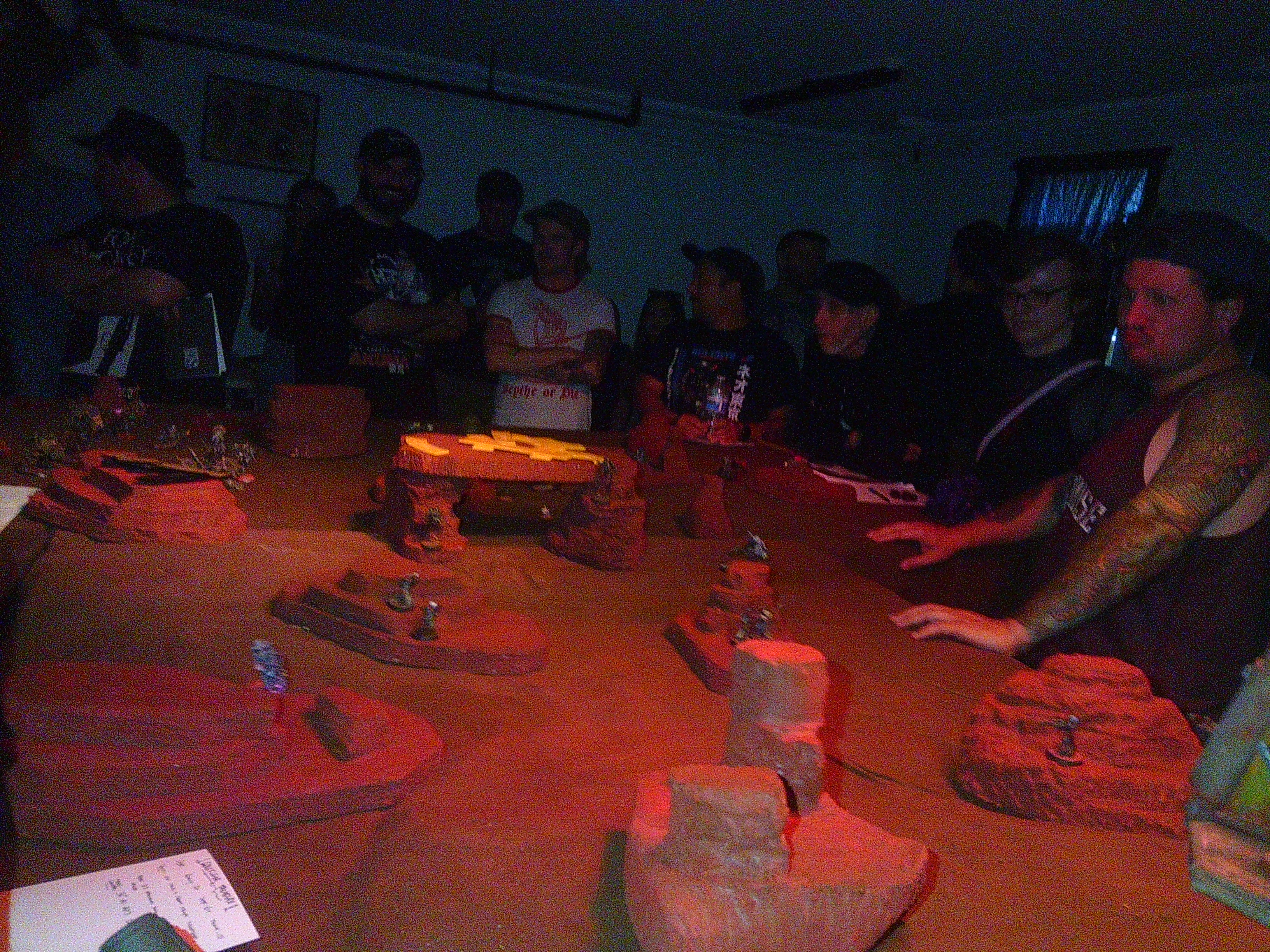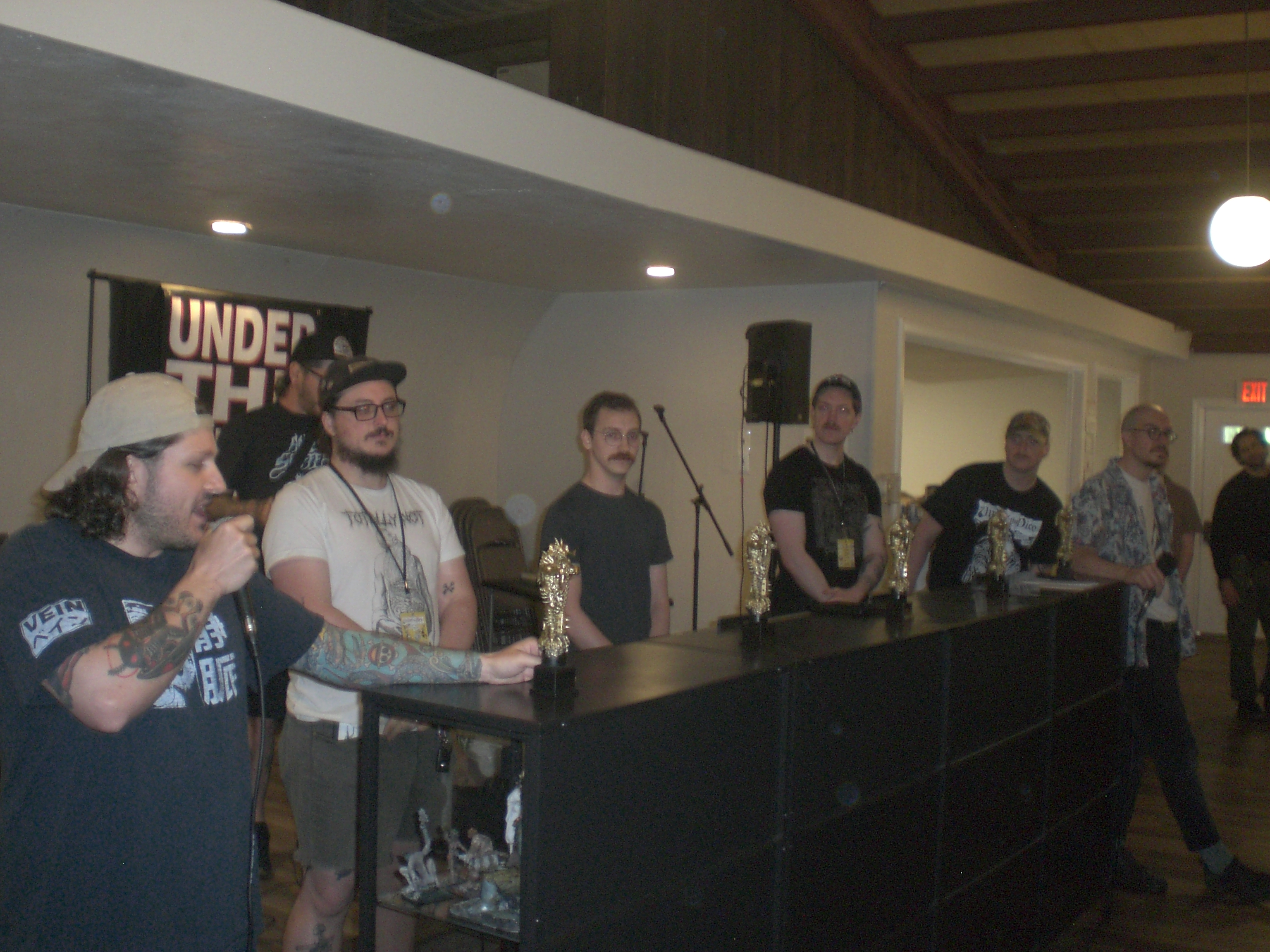 Above: You can see a collection of photos from Under the Dice Fest ’25. Many people captured the event better than me, this is just what I caught on my camera. The packed room for NEMO. A game of 10 Candles being ran outside by Shane the Blind Man. A large group taking part in the Flames of Orion event. The HEMA guys putting on a demonstration of live combat. A large spread of boards from the Warmaster event. Friends from far away face timing in for the musical performances. The Rusted Demon judges standing with the trophies. Terry announcing the winner (Tanner!) of the Berserker Flail, the grand champion of the Rusted Demon.